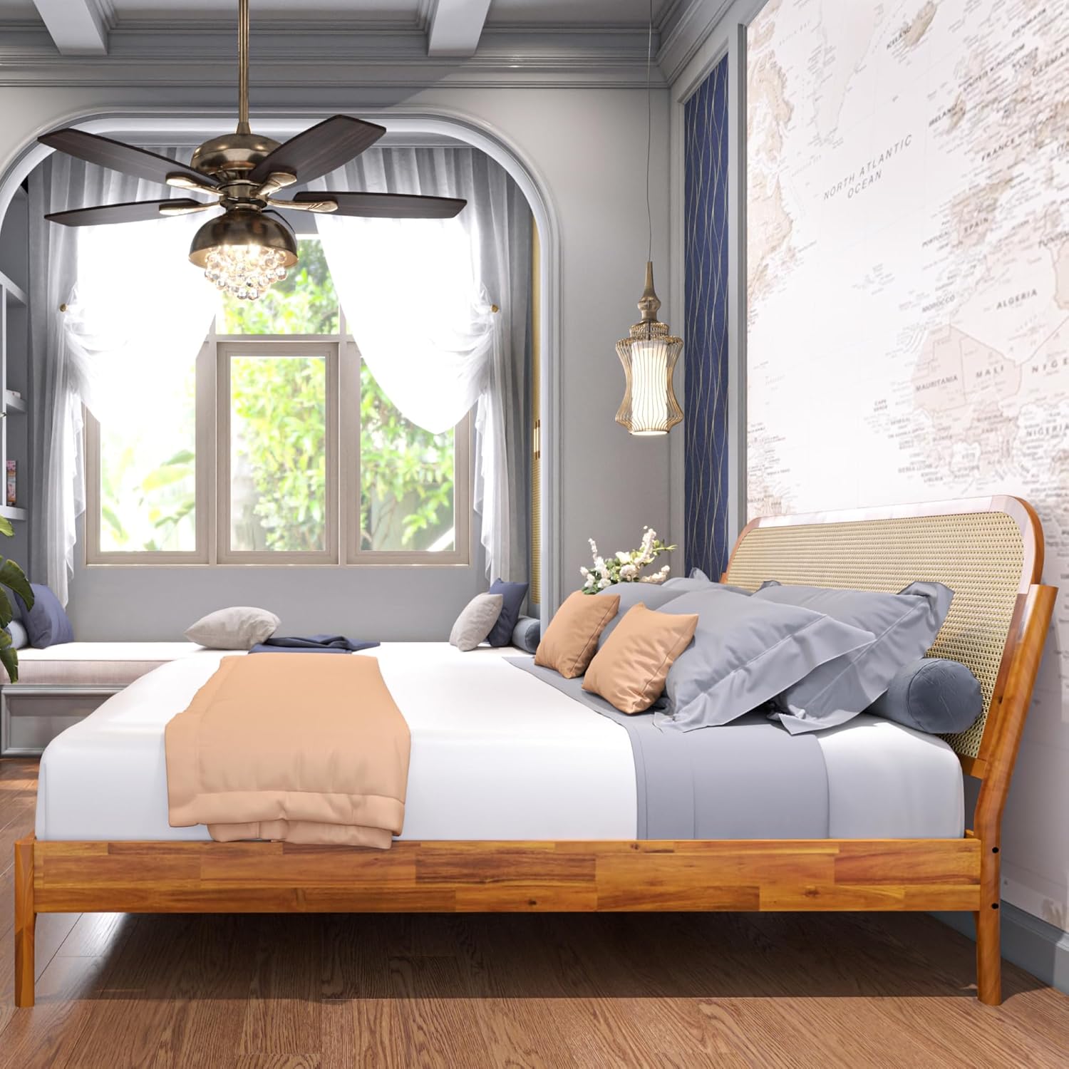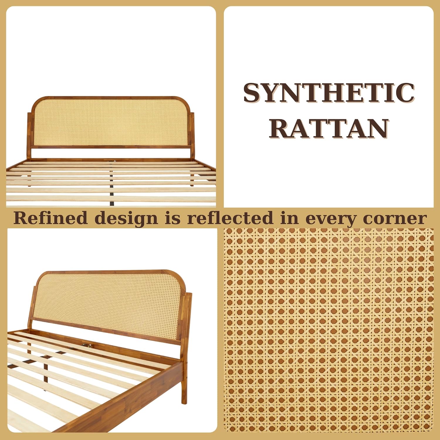 This solid wood bed frame features a beautifully woven rattan headboard with rounded edges, adding a touch of bohemian charm and mid-century modern sophistication to your bedroom.